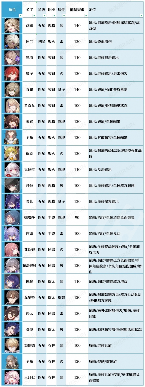 2、丰饶(奶):这些角色是团队中的治疗者,包括娜塔莎、罗刹和白露。